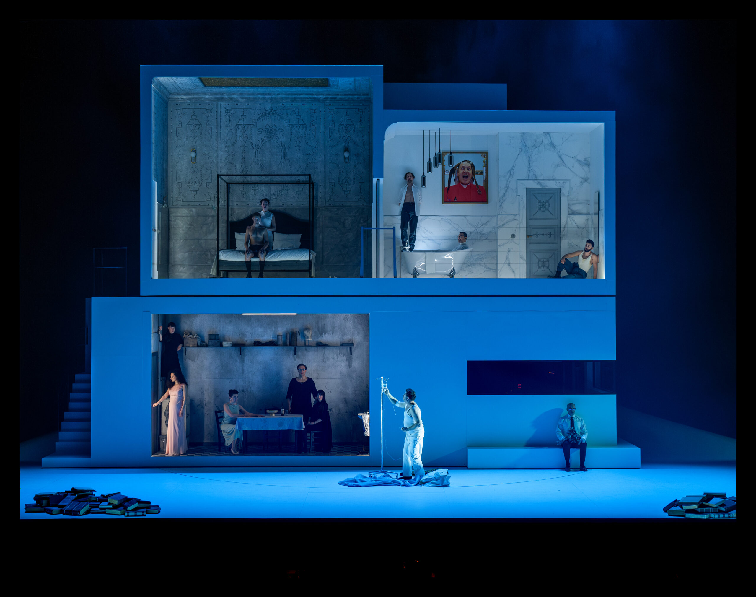 Godo – Nine of the twelve soloists are singing polyphony in this scene. But the only bass among the twelve characters, the paedophile philosopher Sapienza, committed suicide at the end of Miro. So in Godo he sings the concertantes as a ghost in the bathtube.